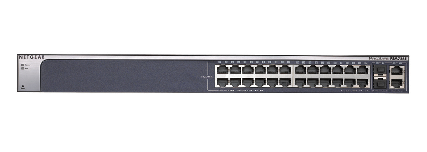 NETGEAR’s low-cost, Fast Ethernet switches deliver maximum throughput and flexibility where you need it – to high-density workgroups at the edge of the network, or in the backbone of small networks. The ProSafe FSM726E is a managed 24-port switch with auto-sensing 10/100Mbps and two combo 1 Gigabit Ethernet (10/100/1000Mbps or SFP fiber) ports. This enables fiber connectivity through two hot-swappable small form-factor pluggable (SFP) gigabit interfaces. The non-blocking design of the switches delivers simultaneous, full wire-speed, low-latency throughput to all ports. In addition, their 1U rack-mount form factor uses less rack space and provides a lower per-port cost than comparable Fast Ethernet switches.
